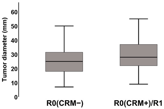 In the 197 patients with histological resection status including CRM, the correlation of complete resection (R0CRM−) and incomplete resection (R1 or R0CRM+) with radiographic variables was evaluated (Table 3). Out of the MDCT variables, tumor diameter and positive MPS significantly correlated with the R1/R0CRM+ resection status (Figure 6 and Table 3).