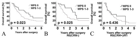 Survival analysis in the 84 R0(CRM+)/R1 resected patients revealed no prognostic significance when stratified according to the MPS status (MPS 0 vs. 1–3 (Figure 7C). The median OS of 1.22 years (95% CI 0.0–2.65) in group MPS 0 (n = 21) was similar compared with MPS 1–3 patients (n = 63) (median OS 1.28 years, 95% CI 0.87–1.69) (p = 0.436).