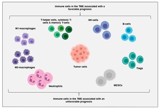 Immune cells and immune-related factors such as soluble molecules play a major role in cancer development and progression [4]. For example, T- and natural killer (NK)-cells are considered essential for effective anti-tumor immunity, while M2-macrophages and myeloid-derived suppressor cells exert tumor-supporting activities in the TME [22,23,24]. The importance of the immune system can be exemplified by the prognostic and predictive value of both the number and phenotype of immune cells in the TME for both immunotherapy interventions and conventional anticancer therapies in many cancers [22,23,24,25,26,27,28]. As a result of enormous immune profiling efforts in solid malignancies, a general overview of critical players in the TME has been generated (Figure 1). Accordingly, cytotoxic T-cells, memory T-cells, T-helper 1 cells, follicular helper T-cells, NK-cells, B-cells, and M1-macrophages have been associated with prolonged survival, while high densities of regulatory T-cells (Tregs), M2-macrophages, myeloid-derived suppressor cells, and neutrophils have been correlated with poor prognosis [23,39,40,41]. Although the prognostic significance of most immune cell types in AML remains to be elucidated, a similar trend has been seen in recent studies on adult AML [42,43,44]. For instance, for adult AML patients treated with chemotherapy, a relatively high proportion of T- and NK-cells in the bone marrow at diagnosis has been associated with improved survival, while the proportion of Tregs has been associated with poor prognosis [42,43,44]. For pediatric AML, such data are not available in literature yet. Since the prognostic importance of immune cells in the TME is increasingly recognized, further improvement of our understanding of immune cells in both adult and pediatric AML will be necessary to move towards immunological-driven biological approaches.