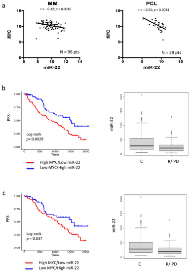 Immunomodulatory imide drugs (IMIDs) exert anti-MM activity by a direct cytotoxic effect and/or by triggering immune-based destruction of MM cells. Recent experimental evidence indicates that these effects are mediated by activation of CRBN-CRL4 E3 ubiquitin ligase, which, in turn, leads to IKZF1/IKZF3 degradation and, finally, MYC downregulation. On these bases, the potential role of MYC-driven miR-22 downregulation as a mediator of IMID-based treatment in MM patients was investigated by interrogating the MMRF-CoMMpass (IA15) dataset. Normalized MYC and MIR22HG expression levels were available for 774 BM_1 MM patients that were profiled by RNA sequencing (RNA-seq). The 774 MM samples of the entire RNA-seq dataset were stratified accordingly to MYC and MIR22HG expression levels, and the groups inversely combining the two extreme quartiles (Figure S1c) were considered in relation to clinical outcome. In particular, 89 MM at higher MYC and lower MIR22HG expression (MYC_IV, MIR22HG_I quartiles) were compared to 69 MM at lower MYC and higher MIR22HG expression level (MYC_I, MIR22HG_IV quartiles) with respect to OS and PFS data. Notably, a significantly poorer survival rate was observed in PFS for those MM patients classified in MYC IV, MIR22HG I quartiles (Figure 1b, left), whereas no significant differences were observed between the two MYC–MIR22HG groups with respect to OS (data not shown).