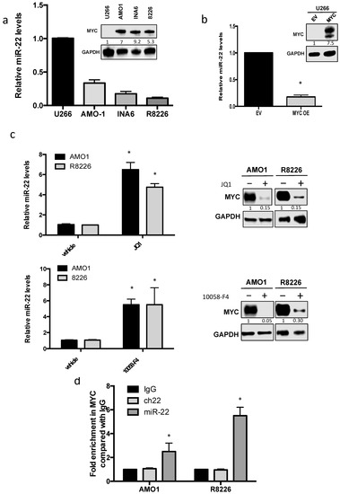 Finally, to confirm the direct transcriptional effect of MYC on miR-22 expression, CHIP analysis was performed. Importantly, a significant enrichment of MYC at miR-22 promoter in MM cells was found, thus confirming that MYC could repress miR-22 in MM by a direct “in cis” effect on its transcription (Figure 2d).