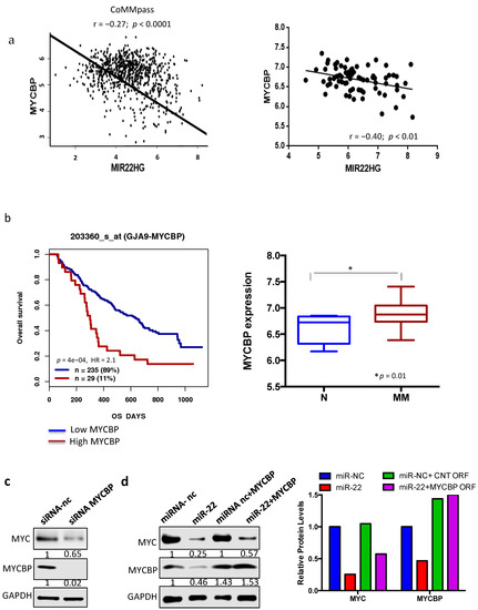 MYCBP as a potential mediator of the MYC–miR-22 loop. (a) Graphs of correlations between endogenous mRNA expression levels of MYCBP and MIR22HG in patients’ multiple myeloma cells from published MMRF-CoMMpass and GSE39925 datasets. (b) Left: prognostic relevance of MYCBP expression on overall survival (OS) of MM patients, resulting from GSE9782 dataset analysis. Right: MYCBP expression in MM patients as compared to healthy donors (N), resulting from GSE47552 dataset analysis. (c) AMO1 cells were transfected with scramble control or MYCBP-specific siRNA. Immunoblot of MYC and MYCBP were performed 48h after transfection. GAPDH was used as a loading control. (d) AMO1 cells were co-transfected with MYCBP ORF or control ORF and miR-22 or scrambled oligonucleotides. Immunoblot (left) and protein quantification analysis (right); GAPDH was used as a loading control. Analysis was performed 48 h after cell transfection. Results are average ±SD of three independent experiments performed in triplicate. * p < 0.05.