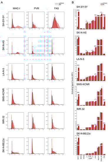 NF-kB p65 subunit enhances the expression of FAS and PVR in NB cell lines. (A) NB cell lines SH-SY-5Y, SK-N-AS, LA-N-5, SMS-KCNR, IMR-32, and SK-N-BE(2)c were transiently transfected for 48 h with either the empty vector pcDNA3 or the vector expressing the p65 subunit and then evaluated for the surface expression of MHC class I, the indicated ligands for NK-cell-activating receptors, TRAIL-R2, and Fas by flow cytometry analysis (Figure S2). Isotype-matched negative control antibodies are displayed as dashed gray and red lines for pcDNA3- and p65-transfectetd NB cell lines, respectively. A representative experiment out of six performed is shown. (B) Summary of six independent flow cytometry analyses. MFI, mean of fluorescence intensity. Mean + SD; * p < 0.05; ** p < 0.01; *** p < 0.001. p value (two-tailed unpaired Student’s t test).