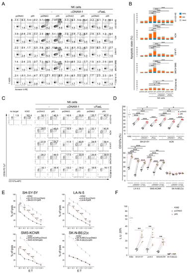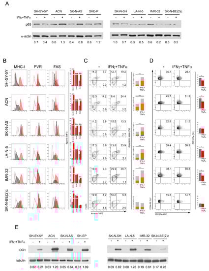 The following antibodies were used: anti-p65 (NB100-2176) purchased from Novus Biologicals, anti-Actin (I-19) purchased from Santa Cruz Biotechnology, anti-IDO1 (D5J4E) from Cell Signaling, and anti-tubulin (TU-02) from Immunological Sciences for Western blotting; anti-CD107a-APC (H4A3), anti-CD3-Alexa Fluor-700 (UCHT1), anti-CD56-PE-Cy7 (B159), anti-CD45 (HI30), and anti-NKG2D-BV605 (1D11) purchased from BD Biosciences, anti-DNAM-1-APC (11A8) purchased from Biologend, anti-KIR2DL1/2DS1-PC5.5 (EB6B) and anti-KIR2DL2/L3/S2-PE (GL-183) purchased from Beckman Coulter (Brea, CA, USA), anti-NKG2A-Alexa Fluor-700 (131411), anti-KIR3DL1-APC (DX9), anti-ULBP1-PE (170818), anti-ULBP2/5/6-PE (165903), anti-ULBP3-PE (166510), anti-MICA (159227), anti-MICB (236511), anti-TRAIL/R2-APC (17908), anti-CD155/PVR-PE (300907), anti-Nectin-2/CD112-APC (610603), and anti-FAS (DX2) purchased from R&D Systems, and goat F(ab’)2 Fragment anti-mouse IgG FITC (IM1619) purchased from Dako for flow cytometry. For some experiments, NB cell lines were treated for 48 h with 50 ng/mL IFNγ (285-IF, R&D Systems) and 20 ng/mL TNFα (210-TA, R&D Systems). The apoptosis state of tumor cells was evaluated by using a PE-conjugated Annexin V apoptosis detection Kit (Biolegend, San Diego, CA, USA) and analyzed by flow cytometry.