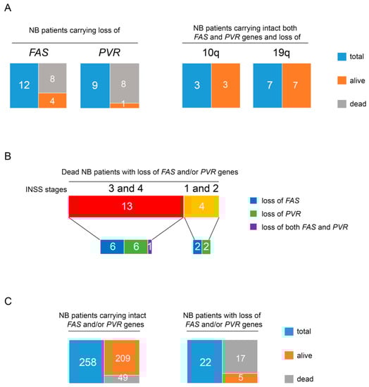 Overall, these data indicate that the loss of FAS and PVR genes occurs independently of disease stage and correlates with low survival in NB patients.