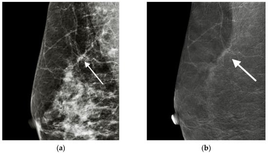 Although mammography is sensitive for microcalcification detection, the cancer probability ranges widely among the various morphologies or distributions of microcalcifications on mammograms, from 2% to 95% in accordance with ACR BI-RADS 4 []. By using an enhancing technique, advanced contrast-enhanced magnetic resonance imaging (CE-MRI) can detect the associated enhancement of glandular tissues adjacent to suspicious microcalcifications. A meta-analysis analyzed 1843 lesions from 20 studies and reported a pooled sensitivity and specificity of 92% and 82%, respectively, for BI-RADS 4 microcalcifications []. CESM has an approximate performance to CE-MRI, with 88.89% sensitivity, 86.56% specificity, 72.72% positive predictive value and 95.08% negative predictive value from a screening population []. Compared to CE-MRI, CESM more easily correlates the microcalcifications on the LM to surrounding glandular enhancement on the REI in the same session of positioning. Another test was designed to have radiologists read the LM first and then read the LM with the REI a day later. The sensitivity, specificity, positive predictive value and negative predictive value of CESM were mildly improved from LM, from 93.8% to 96.8%, from 36.6% to 34.1%, from 54% to 54% and from 88.2% to 92.2%, respectively []. Conversely, the enhancement information from REI did not seem to affect the decision in terms of the bias of personal mammographic knowledge on microcalcifications. Another investigation recently reported a significantly higher predictive positive value and lower misdiagnosis rate when using REIs than when using LMs alone, and a machine learning model could significantly improve the diagnosis of both low-risk (AUC 0.77 using LMs alone to 0.9 with REIs) and high-risk (AUC 0.71 using LMs alone to 0.86 with REIs) groups of microcalcifications []. The additional REI seemed helpful in assessing suspicious microcalcifications.