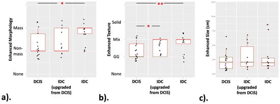The box plots of three lesion groups. These demonstrate the distribution of (a) enhanced morphology, (b) enhanced texture and (c) enhanced size, among three groups. (*: p < 0.05; **: p < 0.01).