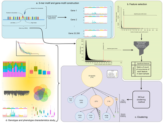 The workflow of pancreatic cancer subtype identification and clustering tree. In the top left, an overall view of the 3-mer motif and the gene-motif concept is illustrated. (a) At first, we construct features named gene-motifs based on the 3-mer motif and the gene that motif has occurred in. These features were constructed for all samples and in all of their protein-coding genes. In the top right, the feature selection process is illustrated. (b) We calculated the number of samples each gene-motif has occurred in, and based on their distributions, we found the most frequent (and hence significant) gene-motifs. We also found the most frequent mutated genes or significantly mutated genes to filter out those gene-motifs that have not occurred in significant genes. This leads to significant features for clustering. (c) The clustering process and tree is illustrated. After constructing a matrix of occurrence for each feature in each sample, (each cell indicates whether a feature has occurred in a sample or not) the Mclust algorithm was employed to cluster samples into subtypes. After two rounds of clustering, five main subtypes revealed themselves. (d) Finally, comprehensive genotype and phenotype characteristic study was performed to find differences and/or commonality in subtypes (bottom left). This includes gene association, mutational signature, deep mutational profile investigation, finding DEGs, survival analysis, etc.
