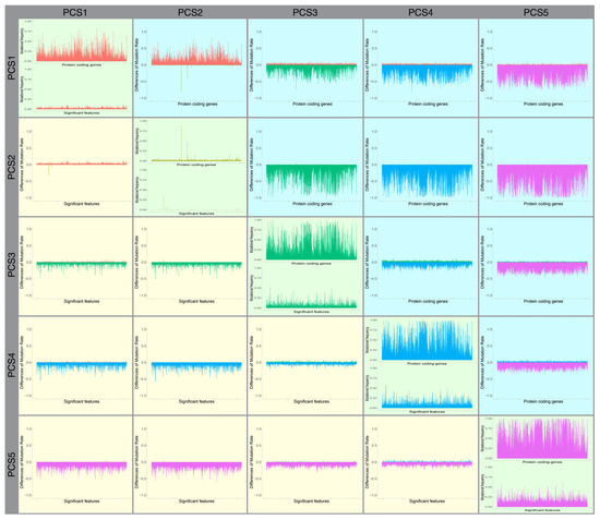 The mutation rate in subtypes and their differences. Bar plots in green tiles exhibit mutation frequency in protein-coding genes and significant features. Yellow tiles include bar plots of differences of mutation rate for significant features and blue tiles include differences in mutation rate in protein-coding genes. For example, the bar plot in the tile which is in PCS2 column and PCS2 row represents the difference of mutation rate in protein-coding genes in PCS2 and PCS1. The color of bars in differential bar plots represents the subtype with the higher mutation rate. For instance, if a bar is differential, the bar plot is red, and PCS1 has the higher mutation rate in that comparison (the same color as bars in the bar plot of mutation rate, in that subtype).