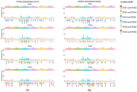 Each mutation and its context (left and right alleles of a mutated position), and the substituted nucleic acid in that position, constructs a 3-nucleotide motif. There are 96 combinations of 3-nucleotide motifs. Patterns of these 3-nucleotide motifs can provide important biological information about the molecular mechanism [28,29,30]. The relative frequency of motifs was calculated cumulatively for subtypes (Figure S3), and common associated genes (Table S4). Motif rates of outlier clusters are provided in Figure S4. Tests for the piqued motifs in common associated genes were undertaken by utilizing the Fisher exact test. For example, we counted the number of samples that had the motif TA-A.A and also were in PCS1 (or PCS3) for the gene NRG1. We tested the relationship between these two dichotomous variables by Fisher’s exact test.