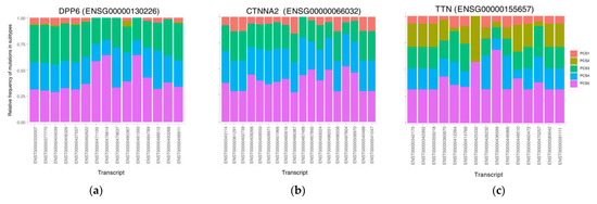 Rate of mutated transcripts in subtypes. Some subtypes tend to mutate more in some transcripts of a gene. This can lead to different outcomes in subtypes. (a) gene DPP6. (b) gene CTNNA2. (c) gene TTN..