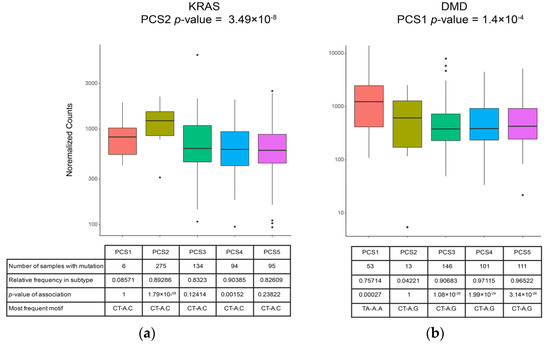 Expression boxplots, mutation, and motif. Expression levels of (a) KRAS and (b) DMD in five subtypes are illustrated in the form of boxplots. Some information about mutations in the genome is also provided in tables under each boxplot to represent the potential association of mutation (and their types) on expression levels.