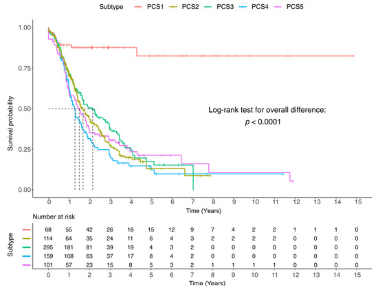 Among other subtypes, PCS3 has the longest overall survival time (25.8 months) which is followed by PCS2 (20.2 months), PCS5 (18 months), and PCS4 (15.5 months) (Table S8). The log-rank test also shows that the overall survival of all subtypes is statistically different (p-value of 0.0001). We also made pairwise comparisons between subtypes with multiple testing methods (see methods section). Among all subtypes, PCS1 has a significantly different survival curve from others, based on all the testing methods. The survival curve of PCS4 is different from PCS1, PCS2, and PCS3 while indicating some similarities to PCS5. PCS2, PCS3, and PCS5 have similar survival curves (Table S9).