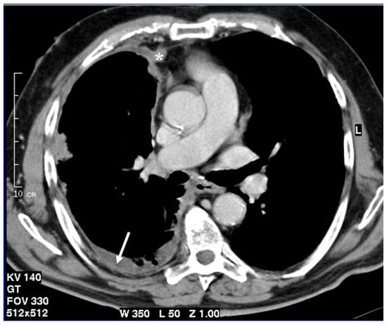 Axial CT scan after contrast administration reconstructed with smooth kernel with mediastinal windows demonstrates circumferential pleural nodular thickening with mediastinal pleura involvement (asterisk) and pleural effusion (arrow).