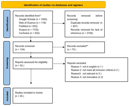 We obtained 4079 studies through searches conducted in the aforementioned databases. Then, we removed 3108 because they were not related to the topic and 837 duplicate records. We screened the titles and abstracts of the remaining 134 studies. After this process, 79 articles were excluded and 55 were assessed for eligibility. After the reading of full text studies, 10 articles were excluded because they did not meet all the eligibility criteria. Overall, 45 studies were included in this review. Figure 2 shows the flowchart for all harvested papers. The studies were then separated into two categories: computer-based methods (Table 1) and magnetic resonance imaging (Table 2).