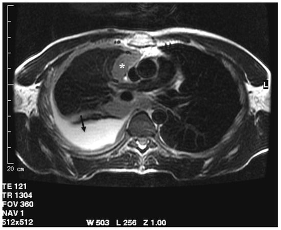 T2-weighted image acquired in the axial plane clearly demonstrates circumferential pleural thickening with mediastinal pleura involvement (asterisk) and pleural effusion (arrow).