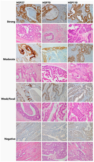 - Oh, H.J.; Kim, J.H.; Lee, T.H.; Park, H.E.; Bae, J.M.; Lee, H.S.; Kang, G.H. Dominant high expression of wild-type HSP110 defines a poor prognostic subgroup of colorectal carcinomas with microsatellite instability: A whole-section immunohistochemical analysis. APMIS 2017, 125, 1076–1083. [Google Scholar] [CrossRef]