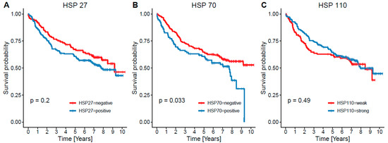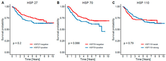 HSP27 is a member of the small heat shock protein family gaining interest as a novel therapeutic option due to its role in apoptosis inhibition and enabling chemoresistance and cancer cell survival in stress conditions [12]. HSP27 has been referred to be overexpressed in cancers of the breast [13], stomach [14], endometrium [15], liver [16,17], and bladder [18] without unequivocal prognostic significance. It has been described to worsen prognosis of prostate adenocarcinoma [19,20,21], acute myeloid leukemia (AML) [22], meningioma [23], pulmonary adenocarcinoma, and colorectal carcinoma [4]; on the other hand, its positive prognostic effect was described in oral squamous cell carcinoma [24] and ovarian carcinoma [25].