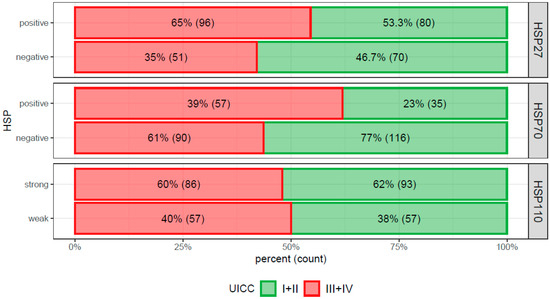 In the Pearson’s chi-squared test, there was a significant association of left sided carcinomas with HSP110 expression and vice versa (p = 0.022): there were 61 and 55 right sided HSP110+/− CRCs, but 118 and 59 HSP110+/− tumors, respectively. Pearson’s chi-squared test did not find any significant association of HSP110 expression with UICC stage (Figure 4), age, grade, morphology, or MMR-status (Figure 5).