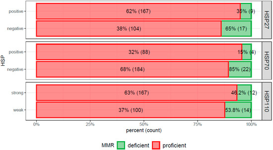 Bar chart documenting the Pearson’s chi squared test showing enrichment of mismatch-repair (MMR) proficient carcinomas with expression of heat shock proteins (HSPs)27 (p = 0.014), 70 (p = 0.117), and 110 (p = 0.153) whereas only HSP27 showed a significant result.