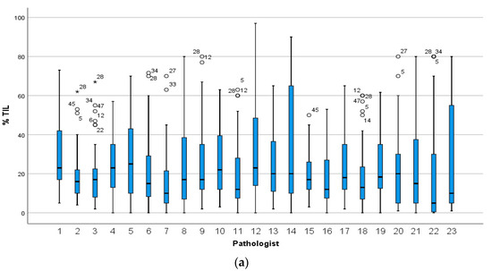 The pathologists’ sTILs scores were collated in MS Excel, with statistical analysis performed in Excel 2007 and IBM SPSS Statistics 25. The scores from each pathologist were compared to each other and across the two circulations, assessed as raw scores and as binary categories using a range of cutpoints. Box-and-whisker plots were used to show both the distribution of sTILs scores per pathologist and the distribution of sTILs scores per slide. The two-way mixed single measures intraclass correlation coefficient (ICC) was used to determine how similar the sTILs percentages scored by different pathologists were for each slide in the study [20,21]. The ICC used in this study was the two-way mixed-effects, consistency, single measure because the aim of the analysis was to examine the consistency of scores across different raters while considering a degree of systematic error (e.g., if they were generally high or low scores), rather than assessing how close the absolute scores were to one another, as a minor difference in absolute scores was considered to be less important [22]. An ICC value between 0.75 and 1.00 was considered as excellent inter-observer agreement; between 0.60 and 0.74 as good agreement; between 0.40 and 0.59 as fair agreement; and less than 0.40 as poor agreement [20]. The Spearman’s correlation coefficient (ρ) was used to measure how closely the raw sTILs scores given by each individual pathologist for the first circulation correlated with the raw scores given by the same individual pathologist for the second circulation. Colour-coded “heat maps” were generated for both circulations, visually portraying the array of individual pathologist sTILs scores for all cases. Statistical significance was determined by a result having a two tailed p value of less than 0.05.