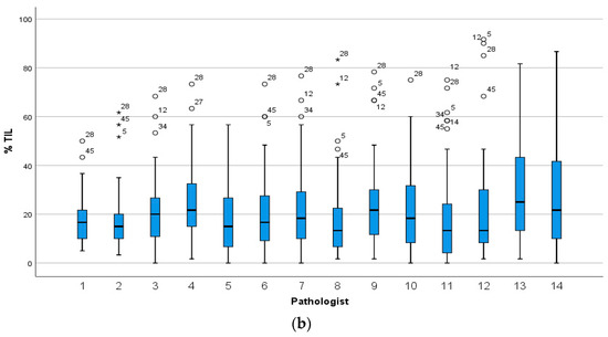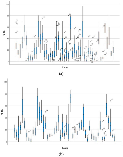 sTILs scores for TNBCs. The range of sTILs scores is shown for the 49 cases in (a) circulation 1 and (b) circulation 2. Cases are displayed from case 1 (left) to 49 (right) on the x-axis in (a,b). Stars and circles are outlier values which lie abnormally far from the other values in the dataset (as defined for Figure 1). The number beside each star and circle is the number of the pathologist for that outlier. The range of scores is wide for many cases.