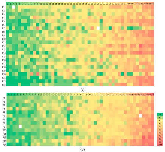 Heatmap of sTILs scores given by pathologists for 49 TNBC cases. A visual representation of sTILs scores in which each row represents a pathologist (numbered as in Figure 1) and each column a case for (a) Circulation 1 and (b) Circulation 2. The colour of each cell represents the sTILs score for the case, increasing from low (green) to high (orange), as denoted in the separate vertical key; missing data are white. The value given in each cell in the top row of each heat map is the median sTILs score for that case in the respective circulation, and the cases are ordered left to right from the lowest to the highest median sTILs score. Outlier scores for a case relative to others appear as mismatches of colour e.g., green cells within a zone of orange. There is more heterogeneity of scores in circulation 1 compared to circulation 2 and the scores given by pathologists 7 and 20 in circulation 1 diverge considerably from others, whereas the scores given by pathologist 7 in circulation 2 align with those of other pathologists. In circulation 2, the scoring pattern of pathologists 4 and 13 appear to diverge from that of others.