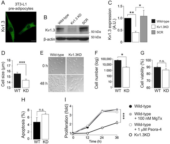Extensive work has unraveled the mechanisms by which Kv1.3 acts on energy homeostasis. An open debate suggests an intricate scenario, in which Kv1.3 function is orchestrated on different tissues. The olfactory bulb, muscle, immune system and brown (BAT) and white (WAT) adipose tissues are involved. Genetic deletion of Kv1.3 leads to a “super-smeller” phenotype by enhancing olfactory sensitivity and discrimination abilities. The olfactory bulb integrates external (odorants) and internal (i.e., insulin, glucose and leptin) stimuli and projects to different brain regions to regulate energy balance. Interestingly, olfactory bulbectomy prevents the effects of Kv1.3 deletion on body weight, suggesting that the anti-obesity effects of Kv1.3 deletion are dependent on olfactory bulb expression [9]. In addition, pharmacological inhibition of Kv1.3 activates BAT, causing an increase in oxygen consumption, energy expenditure and thermogenesis [8]. Inhibition of Kv1.3 also reduces obesity-induced inflammation in WAT. Furthermore, Kv1.3 is aberrantly expressed in different human pathologies, such as autoimmune diseases and cancer [7,10], and regulates cytokine production in macrophages [11]. Indeed, the inhibition of Kv1.3 significantly reduces TNFα and IL-6 levels in WAT [8,12]. There is also evidence that Kv1.3 has a role in peripheral insulin sensitivity. Kv1.3−/− animals are more sensitive to insulin and exhibit low adiposity. In addition, impairing Kv1.3 function ameliorates the diabetic phenotype [12]. Interestingly, Kv1.3 expression and activity in WAT is insulin-dependent, and it regulates glucose uptake and adipocyte physiology [13]. We reveal a new role for Kv1.3 in the control of body weight through the regulation of preadipocyte proliferation.