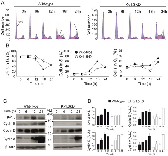 The activity and expression of many K+ channels is cell cycle-dependent [14]. To further elucidate the effect of Kv1.3 during cell cycle progression, we performed cell cycle analysis on WT and Kv1.3KD preadipocytes (Figure 2). Cells were serum starved, and the number of cells in each phase of the cell cycle at different times was analyzed after serum readdition. Starvation arrested 80% of cells in the G0/G1 phase. Upon serum readdition, WT preadipocytes re-entered the cell cycle, and the percentage of cells in the G0/G1 phase decreased at 18 h with a concomitant increase in the S phase. A further increase in the number of cells in the G2/M phase at 24 h indicated that WT preadipocytes progressed in the cell cycle. In contrast, the percentage of Kv1.3KD preadipocytes in the G0/G1 and S phases indicated a delayed G1/S transition during cell cycle progression. An absence of sub-G0/G1 peaks indicated that the level of apoptosis was negligible (Figure 2A,B).