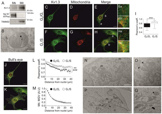 Further visual analysis suggested that mitochondrial Kv1.3 expression was not homogeneous. Kv1.3 was concentrated in perinuclear mitochondria (Figure 3E(a,b),H(a,b)). Thus, we performed bull’s eye analysis (Figure 3J–M). Kv1.3 mitochondrial localization decreased with the distance from the nucleus during the G0/G1 and G1/S transitions (Figure 3J–L). In addition, the affinity of Kv1.3 for perinuclear mitochondria was enhanced during the G1/S phase (Figure 3L). However, no differences were found in mitochondrial distribution throughout the cell cycle (Figure 3M). Moreover, electron microscopy confirmed Kv1.3 localization in perinuclear mitochondria (Figure 3N–Q).