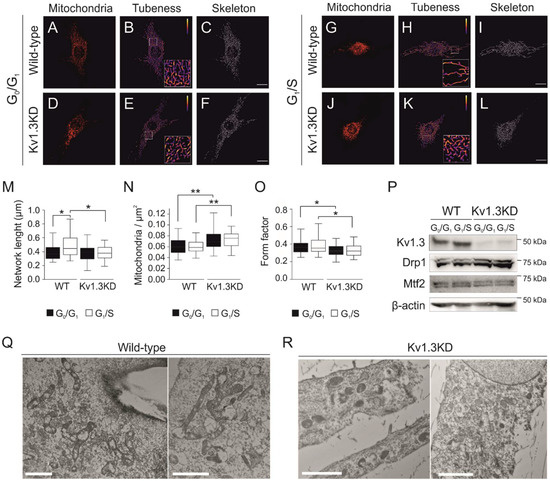 Kv1.3 regulates the mitochondrial fusion/fission equilibrium during the G1/S transition. Confocal images showing mitochondria in cells fixed in the G0/G1 (A–F) and G1/S (G–L) phase for WT (A–C,G–I) and Kv1.3KD preadipocytes (D–F,J–L). The scale bar represents 20 µm. Images were processed (tubeness and skeleton) to perform morphometric analysis of mitochondria. (M) The length of mitochondrial networks was measured as the average area of the skeletonized binary image. (N) Number of mitochondrial particles per µm2. (O) The form factor describes the particle shape complexity and was computed as the average (perimeter)2/(4π·area). A circle corresponds to a minimum value of 1. The data are the mean ± SE (n > 30). *, p < 0.05; **, p < 0.01 (one-way ANOVA). (P) Protein expression of Kv1.3, dynamin-related protein 1 (Drp1) and mitofusin 2 (Mtf2) during the G0/G1 and G1/S phase in WT and Kv1.3KD 3T3-L1 preadipocytes. β-actin was used as a loading control. (Q,R) Electron micrographs showing mitochondria of WT (Q) and Kv1.3KD (R) 3T3-L1 preadipocytes during the G1/S phase. Note that, unlike those in Kv1.3KD, mitochondria in wild-type cells were highly fused.