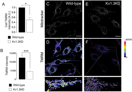 Kv1.3 deficiency greatly affected mitochondrial dynamics during cell cycle progression. Therefore, we wondered whether the mitochondrial membrane potential was also altered (Figure 5). The mitochondrial membrane potential was analyzed during the G1/S transition by TMRM. Mitochondria from WT and Kv1.3KD cells were identified by MitoTracker staining (Figure 5C,E). Mitochondria from Kv1.3KD cells were dramatically depolarized (Figure 5A,B,D,F). These results further suggest that Kv1.3 participates in mitochondrial dynamics in cell cycle progression during proliferation.