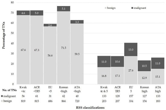 All TNs were classifiable according to Kwak-TIRADS, ACR TI-RADS, and Korean-TIRADS. A total of 3 (0.2%, 1 malignant) and 135 (11.1%, 16 malignant) TNs could not be classified using EU-TIRADS and ATA Guidelines, respectively (Figure 1). The RSS classification results are displayed in Figure 2.