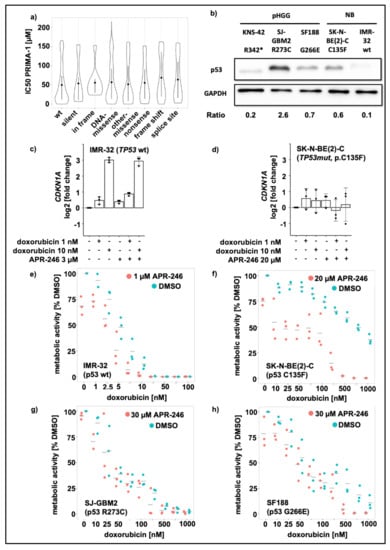 TP53 mutation status insufficiently predicts the APR-246/PRIMA-1 response. (a): PRIMA-1 sensitivity separated according to TP53 mutation status derived from Cancer Cell Line Encyclopedia and CTD2 portal (n = 805); (b): Expression of p53 is shown in the Western blot of the whole cell lysates of one TP53 nonsense mutated cell line (KNS-42), three TP53 missense mutated cell lines (SJ-GBM2, SF188, SK-N-BE(2)-C) and one TP53 wild type cell line (IMR-32). GAPDH served as loading control. The ratio indicates normalization of p53 to the GAPDH signal; (c,d): RT-PCR measurement of TP53 pathway activation. CDKN1A expression is depicted as log2 transformed fold change to solvent control. Treatment was applied for 24 h with doxorubicin or APR-246, alone or in combination, as indicated; (e,f): metabolic activity measurement with CellTiter Glo-assay in neuroblastoma cell lines IMR-32 (e) and SK-N-BE(2)-C (f) after 72 h treatment. IMR-32 (e) were treated with 0–100 nM doxorubicin alone (blue) or in combination with a fixed APR-246 concentration of 1 µM (red). SK-N-BE(2)-C (f) were treated with 0–1000 nM doxorubicin alone (blue) or in combination with a fixed APR-246 concentration of 20 µM (red). Luminescence was normalized to the solvent control (DMSO). (g,h): metabolic activity measurement with CellTiter Glo-assay in pediatric high-grade glioma cell lines SJ-GBM2 (g) and SF188 (h) upon 72 h treatment. Both were treated with 0–1000 nM doxorubicin alone (blue) or in combination with a fixed APR-246 concentration of 30 µM (red). Luminescence was normalized to the solvent control (DMSO).