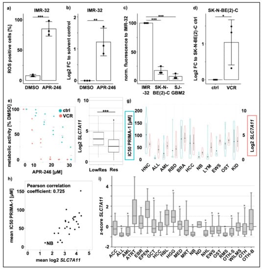 APR-246 response depends on the ROS levels. (a): The percentage of ROS positive IMR-32 cells after treatment with 50 µM APR-246 for 5 h compared to solvent control (DMSO) detected after DCFDA staining by FACS; (b): Log2 fold change of BODIPY positive IMR-32 cells after treatment with 50 µM APR-246 for 5 h compared to solvent control (DMSO) detected by FACS; (c): Basal ROS level in IMR-32, SK-N-BE(2)-C and SJ-GBM2 detected after DCFDA staining by FACS. Data were normalized to IMR-32 signal; (d): Log2 fold change of basal ROS level in vincristine resistant SK-N-BE(2)-C compared to control SK-N-BE(2)-C detected after DCFDA staining by FACS; (e): Metabolic activity measurement with CellTiter Glo-assay in vincristine resistant SK-N-BE(2)-C (red) and control SK-N-BE(2)-C (blue) after 72 h treatment with APR-246 0–30 µM. Luminescence was normalized to the respective solvent control (DMSO); (f): Log2 SLC7A11 expression of PRIMA-1 less responsive cell lines (LowRes, IC50 < 20 µM) compared to responsive cell lines (Res, IC50 > 20 µM) from the Cancer Cell Line Encyclopedia (n = 744); (g): Combination of log2 SLC7A11 expression and PRIMA-1 sensitivity stratified by cancer cell line entities with data obtained from Cancer Cell Line Encyclopedia and CTD2 portal (n = 229); (h): Plot of the mean log2 SLC7A11 expression of entities (n = 26) from the CCLE against the mean PRIMA-1 IC50 of the respective entities. Pearson correlation coefficient was calculated using R software; (i) Z-scores of SLC7A11 log2 expression from INFORM patient samples stratified by entities and analyzed with R2 (n = 1643). ACC: adrenocortical carcinoma, ALL: acute lymphoblastic leukemia, AML: acute myeloid leukemia, ATRT: atypical teratoid/rhabdoid tumor, BRA: Brain cancer, EBR: embryonal brain tumor, EPEN: ependymoma, GCT: germ cell tumor, HCC: hepatocellular carcinoma, HBL: hepatoblastoma, HCC: Liver cancer, HGG: high-grade glioma, HNC: Head and Neck Cancer, KID: Kidney Cancer, LYM: Lymphoma, MED: medulloblastoma, MRT: malignant rhabdoid tumor, NB: neuroblastoma, ND: not defined, NHL: non-Hodgkin lymphoma, EWS: Ewing sarcoma, OST: osteosarcoma, RBD: Rhabdoid, RMS: rhabdomyosarcoma, OTHS: other sarcoma, WILMS: nephroblastoma, OTH: other, OTHB: other brain tumor. * p < 0.05, ** p < 0.01, *** p < 0.001.