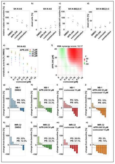 Combining APR-246 with HDAC inhibition effectively sensitizes neuroblastoma in vitro and in vivo. Determination of viable cell number/mL normalized to solvent (DMSO)-treated cells (a,c) and dead cell count (b,d) after automated Trypan blue exclusion assay of neuroblastoma cell lines SK-N-AS and SK-N-BE(2)-C. Cells were pretreated with 0.5 µM vorinostat for 72 h and afterwards treated with 20 µM APR-246 for 24 h. Bars indicate control, single and sequential treatment; (e,f): metabolic activity measurement via CellTiter Glo-assay in neuroblastoma cell line SK-N-AS after 72 h treatment with 0–10 µM vorinostat combined with fixed APR-246 concentrations of 0 µM, 15 µM, 30 µM and 45 µM. Normalization was performed to the solvent control (DMSO). Synergy calculation (f) was performed with synergyfinder (https://synergyfinder.fimm.fi, accessed 30 April 2020) by applying HSA (highest single agent) model; (g–n): waterfall plots demonstrating the change in tumor volume (%) for each individual xenograft, from baseline (day 1 = start of the treatment) to day 3 after yolk sac-implantation of NB-1 (g–j) and IMR-32 (k–n)) cells. Dotted lines are drawn according to Response Evaluation Criteria in Solid Tumors (RECIST) 1.1 adopted for zebrafish tumors, to visualize the best response: progressive disease (PD), at least a 20% increase in tumor volume; partial response (PR), at least a 30% decrease in tumor volume; each bar reflects one individual xenograft. The following treatments were applied: APR-246: 50 µM; vorinostat: 15 µM and combination.