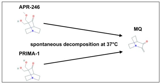 Over the last 20 years, novel drugs were developed to reactivate mutated p53 [10]. The most advanced drug is APR-246, which is currently being tested in 12 clinical trials [11]. A phase III clinical study is assessing the efficacy of APR-246 in combination with azacytidine (NCT03745716). APR-246 is showing a very promising clinical potential, with a maximum plasma concentration of approximately 280 µM and a half-life of four to five hours, which corresponds to an estimated trough plasma concentration of 15–20 µM [12,13,14]. APR-246 is the methylated functional analogue of PRIMA-1, which was discovered in a cellular viability screening with an inducible expression system for mutant TP53 in TP53 knockout SAOS-2 cells [15]. Subsequent cell culture studies demonstrated that the prodrugs PRIMA-1 and APR-246 are converted spontaneously to reactive methylene quinuclidine (MQ) (Scheme 1) [16]. MQ covalently binds to cysteine residues of the mutant p53 (namely cysteine 124 and 277), which changes the protein’s conformation. This restores its DNA-binding function and induces a strong apoptotic signal [15,17].
