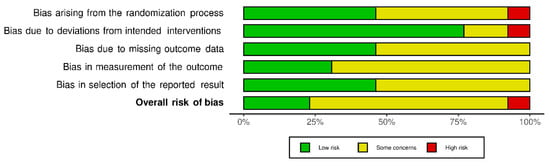 - Sterne, J.A.C.; Savovic, J.; Page, M.J.; Elbers, R.G.; Blencowe, N.S.; Boutron, I.; Cates, C.J.; Cheng, H.Y.; Corbett, M.S.; Eldridge, S.M.; et al. RoB 2: A revised tool for assessing risk of bias in randomised trials. BMJ 2019, 366, l4898. [Google Scholar] [CrossRef] [PubMed] [Green Version]