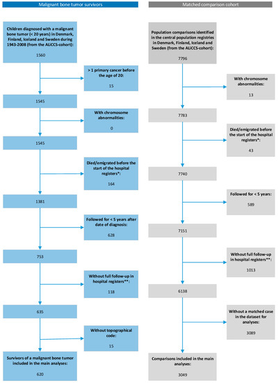 Five comparisons for each cancer survivor were selected at random from the population registers and matched to survivors by sex, age, and country (Denmark, Finland, and Iceland) or county (Sweden). The vital and migration status of survivors and comparisons was obtained from the national population registers. Comparisons had to be alive on the date of the cancer diagnosis of the corresponding survivor and without a cancer diagnosis before 20 years of age. A total of 7796 comparisons from the general population were matched to the 1560 survivors of a malignant bone tumor. After relevant exclusions, the final dataset comprised 620 five-year survivors and 3049 comparisons (Figure 1).