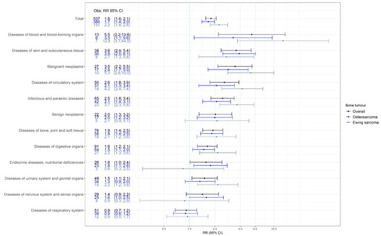 The relative rates of hospital contacts for survivors of childhood malignant bone tumors were increased for 11 of the 12 main disease groups (statistically significantly in 10 of 12) (Figure 2). The rate of hospital contacts for respiratory diseases (RR 0.92; 95% CI 0.68–1.22) was similar to that in matched comparisons. The highest rates were seen for diseases of the blood and blood-forming organs (RR 5.46; 95% CI 2.20–13.59), followed by diseases of the skin and subcutaneous tissue (RR 3.57; 95% CI 2.37–5.38) and malignant neoplasms (RR 3.47; 95% CI 2.18–5.52). In survivors of osteosarcoma, the highest rate was seen for diseases of the skin and subcutaneous tissue (RR 3.88), followed by diseases of the blood and blood-forming organs (RR 3.30) and malignant neoplasms (RR 2.87). In survivors of Ewing sarcoma, the three highest rates were observed for diseases of the blood and blood-forming organs (RR 12.81), malignant neoplasms (RR 5.33), and diseases of the circulatory system (RR 4.22).