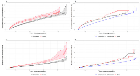 Cumulative incidence of first hospital contact and 95% confidence intervals (CIs) by time since diagnosis or entry for survivors and comparisons (panels A and B). Expected numbers of hospital contacts (mean cumulative count) with 95% CI for survivors and their matched comparisons by time since diagnosis or entry (panels C and D).