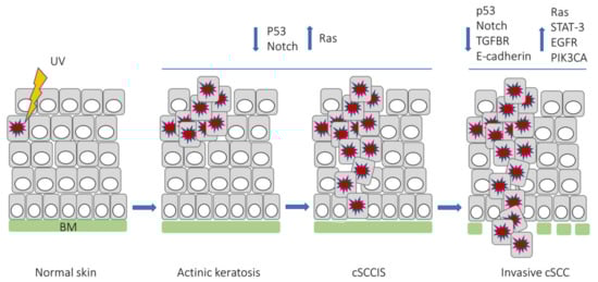 The combination and order of the molecular alterations in cSCC initiation and progression is not fully understood, as some of these changes are found already in normal sun-exposed skin without any sign of malignancy. It appears that the number of driver mutations per cell is a major contributor to cancer initiation, as these cells are clonally expanding, and their genomic instability results in increased mutational burden [49]. However, it is evident that alterations in the tumor microenvironment are also required to promote the progression of AK to invasive cSCC.