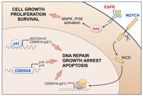 Genetic alterations involved in cSCC progression. Mutational inhibition of wild-type function (in blue) of TP53, CDKN2A, or NOTCH1/2 predisposes cells to genomic instability and uncontrolled growth as the expression of their downstream targets, cell cycle regulators p21, p14, and p16 is abrogated. Notch is also transcriptionally regulated by p53. Notch intracellular domain (NICD) is cleaved upon ligand binding and transported to the nucleus to regulate gene transcription in co-operation with other factors. Mutational activation (in red) of EGFR or HRAS induces cell proliferation and survival via MAPK and PI3K signaling.
