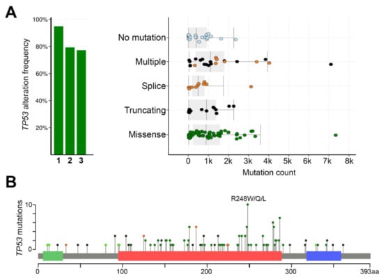 Mutations in TP53 gene in cSCC in cBioPortal database [102,103]. (A) Left: TP53 alteration frequency in three independent cSCC cohorts comprising a total of 125 samples (1 = MD Anderson [39], 2 = DFCI [38], 3 = UCSF excluding cSCCs with hereditary disorders). Right: Mutation plot showing p53 mutation type and count in cSCCs. (B) The number and position of mutations in the TP53 gene. The green bar indicates p53 transactivating domain, the red bar the DNA-binding domain, and the blue bar the p53 tetramerization motif. The circles are colored with respect to the corresponding mutation types (green = missense, black = truncating, orange = inframe deletion or insertion). The hotspot mutation R248W/Q/L is highlighted in the plot.
