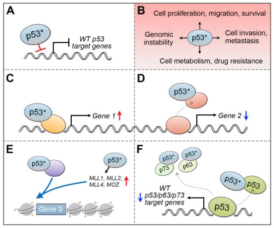 Mutant p53 gain-of-function mechanisms. (A) A missense mutation in the TP53 DNA-binding domain (e.g., in amino acid residue 248) can disturb p53 protein binding to gene regulatory areas and prevent transcription of the p53 wild-type target genes. (B) Gain-of-function p53 mutants can influence several cellular processes to facilitate cancer progression. (C) The mutant p53 (p53*) cannot recognize the p53 DNA response elements, but it can bind to various transcription factors (in orange) and recruit them to gene promoters to activate transcription. (D) In some instances, mutant p53 may decoy transcription factors (in red) from their target sites and inhibit transcription. (E) Mutant p53 can upregulate expression of chromatin remodeling proteins, such as MLL1, MLL2, MLL4, and MOZ, or bind to and recruit chromatin modifying proteins (in purple, e.g., MLL4 or the SWI/SNF complex) to alter the epigenetic state of the chromatin and make it accessible for gene transcription. (F) Mutant p53 may inhibit the wild-type p53, or other p53 family members p63 or p73 (in green) in a dominant-negative manner, where it complexes with the wild-type p53/p63/p73 to block its function and target gene expression.