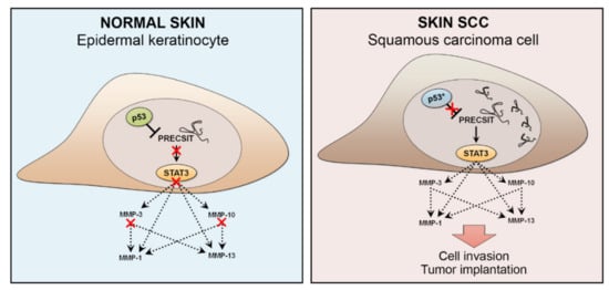 MiRNA regulation is very context-dependent, and certain miRNAs are specifically regulated by mutant p53. For example, miR-1246 is induced by mutant p53 in colon cancer, and miR-34 is suppressed by mutant p53 in lung cancer [144]. Thus, it is possible that these two miRNAs are regulated in a similar manner in cSCC, as elevated levels of miR-1246 have been detected in cSCC tissue and serum [149,150], whereas miR-34, a downstream target of p53, is downregulated in cSCC [80]. PRECSIT (p53 regulated carcinoma-associated STAT3 activating long intergenic non-protein coding transcript) is a recently characterized lncRNA with a tumorigenic function in cSCC [151] (Figure 5). A nonsense mutation in TP53 can cause premature p53 translation termination, leading to undetected p53 protein expression. Here, PRECSIT was shown to be upregulated in cSCC, and its high expression was specifically associated with loss of p53 in cSCC in vivo [151]. This suggests that loss of p53 may promote PRECSIT expression in cSCC progression. In accordance with this, delivery of a wild-type p53 into cSCC cells, which harbor mutated p53 led to downregulation of PRECSIT expression, indicating that its expression is suppressed by p53. PRECSIT was further shown to activate STAT3-signalling and expression of MMPs and invasion of cSCC cells [151] (Figure 5).