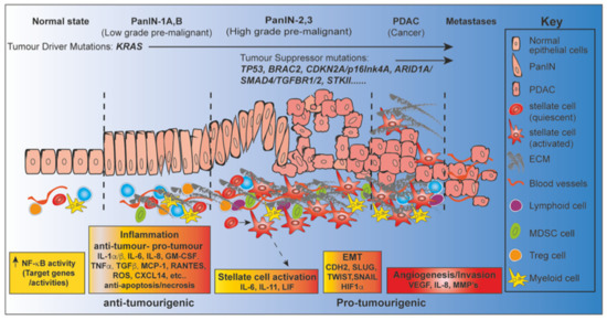 The role of NF-κB from Pancreatic Ductal Adenocarcinoma (PanIN) to Pancreatic Ductal Adenocarcinoma (PDAC) in a step-wise model.