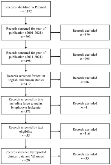 Relevant literature using the key word “large granular lymphocyte leukemia” was searched in PubMed database from 1977 to July 2021. Limiting factors were “large granular lymphocyte leukemia”, and full text available in English language. Two investigators independently reviewed the reference list for potential eligible manuscripts, and selected articles were then reviewed independently for inclusion in the analysis. Studies were included when: (1) the year of publication was between 2011 and 2021; (2) the studies were conducted on humans and reported clinical data and Vβ usage by flow cytometry; and (3) the studies were on T-LGL leukemia (Figure 2).