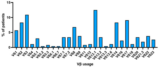 In available kits, antibodies are conjugated to fluorescein isothiocyanate (FITC), phycoerythrin (PE), or tandem FITC/PE; therefore, sample acquisition requires instruments equipped just with a blue laser (488 nm excitation) and sensors for detection of FITC and PE emission wavelengths (peaks at 525 nm and 574 nm, respectively) [45,68]. Vβ usage by flow cytometry also allows absolute clone count and simultaneous characterization of TCR Vβ distribution in different lymphocyte subsets using appropriate antibody combinations [74]. For example, TCR Vβ usage has been studied on CD3+, CD4+, and CD8+ T cells [74,88,89] in LGL leukemia patients, or in naïve, effector, and memory lymphocytes in healthy subjects [57], or in total CD4+ and CD8+, effector CD4+CD28+ and CD8+CD28+, and effector memory CD4+CD28−CD57+ and CD8+CD28−CD57+ cells in AA [53,70,71]. When a known immunodominant clone has to be monitored (e.g., during treatment or follow-up), immunophenotype of LGLs can be combined with conjugated antibody corresponding to the expanded Vβ family in a multiparametric staining [74]; however, the fluorophore choice for some Vβ family is constrained, as Vβ4 is conjugated only with tandem FITC/PE, Vβ6.1, Vβ6.7, Vβ12, Vβ13.3, and Vβ20 only with FITC, and Vβ13.2 only conjugated with PE (Figure 1). Antibodies conjugated with fluorophores excited by violet (405 nm) and ultraviolet (320 nm) lasers are available for Vβ3, Vβ5.1, and Vβ8, and conjugated in VioBlue (excitation 400 nm/emission 452 nm) for Vβ2, Vβ11, Vβ13.1, and Vβ21.3. Recombinant antibodies are also available for Vβ2, Vβ5.1, Vβ5.3, Vβ7.1, Vβ7.2, Vβ11, Vβ13.1, Vβ13.6, Vβ14, Vβ16, Vβ17, Vβ21.3, and Vβ23. The advantages of recombinant antibodies are reduced lot-to-lot variability and higher purity, because antibodies are produced using a specific DNA sequence for one type of heavy and light chain using mammalian cell lines. Moreover, constant region is the same specifically mutated IgG1 sequence requiring only one type of isotype control [90].