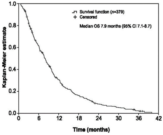 The primary study outcome was OS, which was defined as the time from trifluridine/tipiracil start to patient death from any cause. Secondary efficacy outcomes included PFS measured as the time from trifluridine/tipiracil start to radiologic disease progression or death from any cause, and PFS measured as the time from trifluridine/tipiracil start to clinical disease progression or death from any cause. Other secondary efficacy outcomes were OS and PFS rates at 2, 4, 6, 8, 10, and 12 months, overall response rate (percentage of patients with a complete or partial response), disease control rate (percentage of patients with complete or partial response or stable disease, with stable disease assessed at least 6 weeks after starting trifluridine/tipiracil), changes in ECOG performance status (improved, maintained, or worsened), and associations between OS and patient characteristics. Trifluridine/tipiracil exposure/management and grade ≥ 3 treatment-related adverse events were additional secondary outcomes.